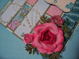 that pink scrap. Thirdly, two strips of Olive and Lagoon CS. The frame was two Sizzix diecuts of Lagoon and Vintage Lovely glued together and inked with Antique Linen Distress. The bling is from Prima purchased at Hobby Lobby for 50% off (should have bought a ton more).