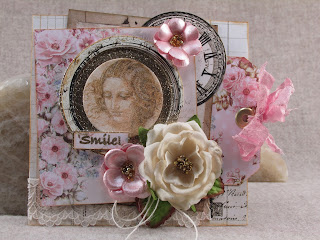 My "dear friend" card is created with more of my older Prima papers and some from the 6.5" Kaisercraft Vintage Timeless paper pad. I love the gray and pink together... so pretty. Colors that are just made for each other. I have some of my older embellishments worked in here too... a Prima medallion from one of their trims, some half pearl trim, and a silver, rose charm. The "girls" photo is one of Tim Holtz Found Relatives that I ran through my Vagabond with an MFT Stitched Rectangle die. I backed it with another larger die-cut and a piece of silver glitter paper from Hobby Lobby.