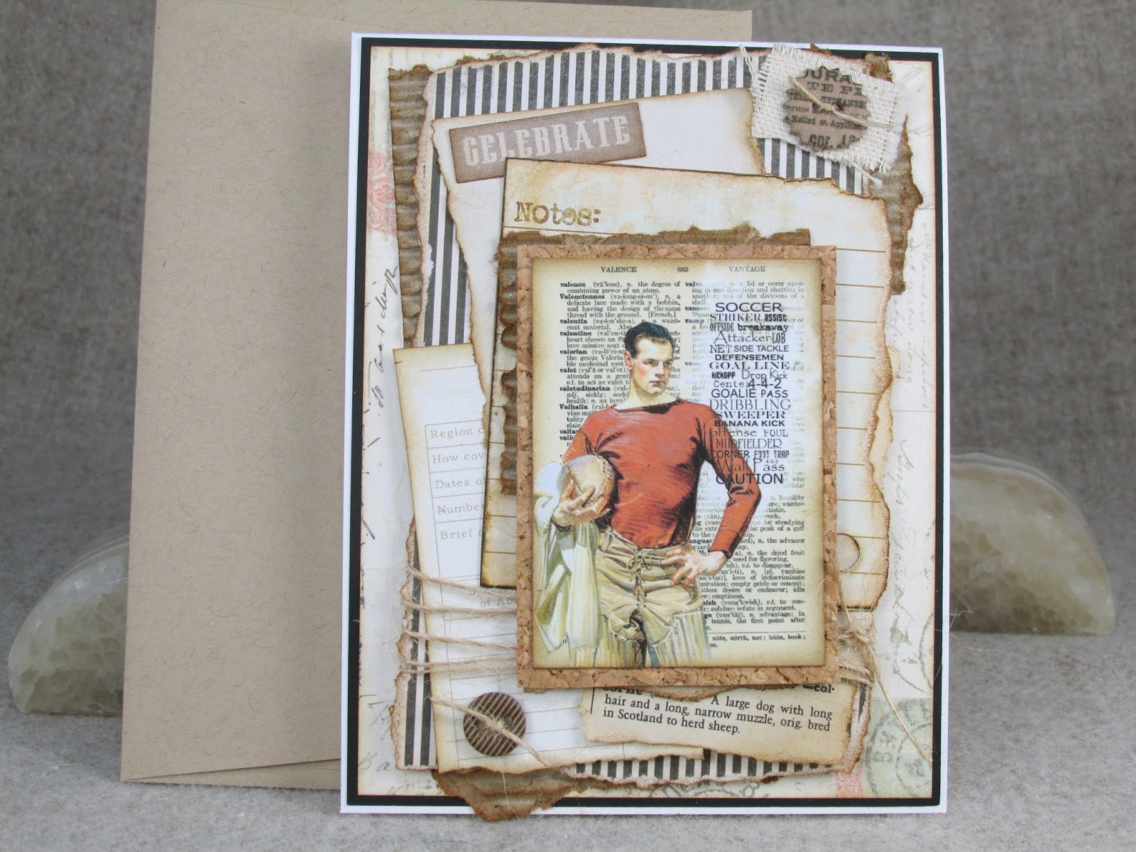 I have a top folding A2 masculine card up today featuring another digi vintage sports image. With it I grabbed up some more scraps from my pile and put them together with Tim Holtz Textured Surfaces corrugate and cork, and old dictionary paper. I tied on a length of natural burlap string, a scrap of torn fabric, glued on two My Mind's Eye chipped board buttons and one of their sentiment stickers. Love the look!